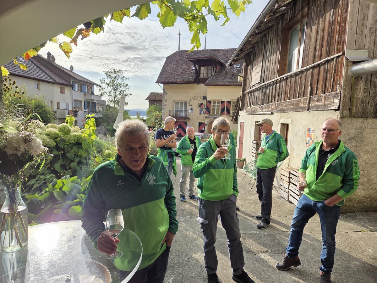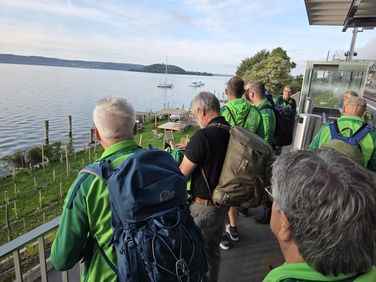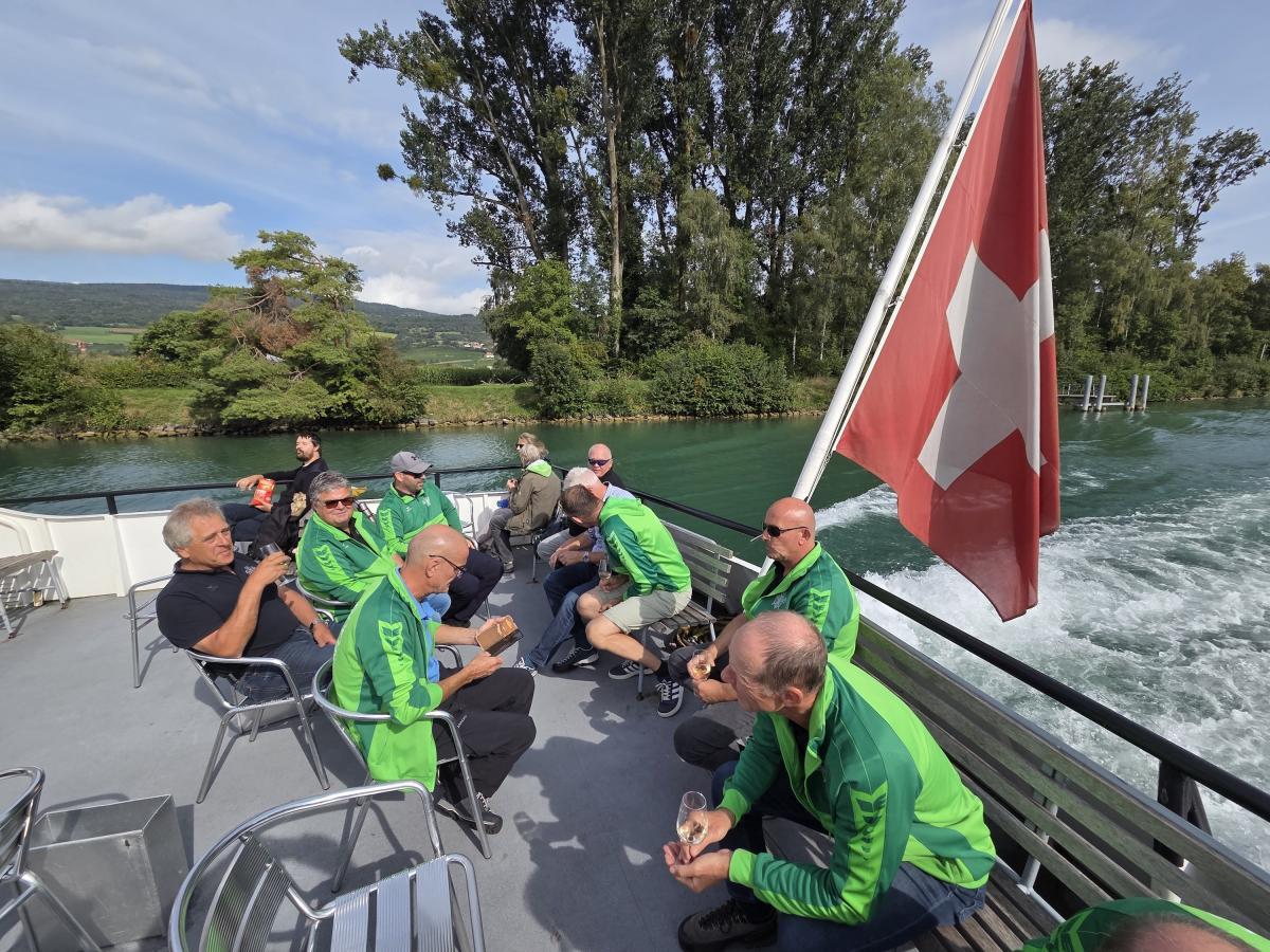 Die Turnfahrt 2025 führte uns in die Region Seeland. Wir reisten in einem nicht bedienten Speisewagen, das nahmen wir mit einem Schmunzeln 😉. Bald standen auf allen Tischen Weinflaschen, Stefan freute sich besonders. Ruedi hatte Fleisch und Brot mit dabei und somit hatten wir alles für den 1. Apéro.