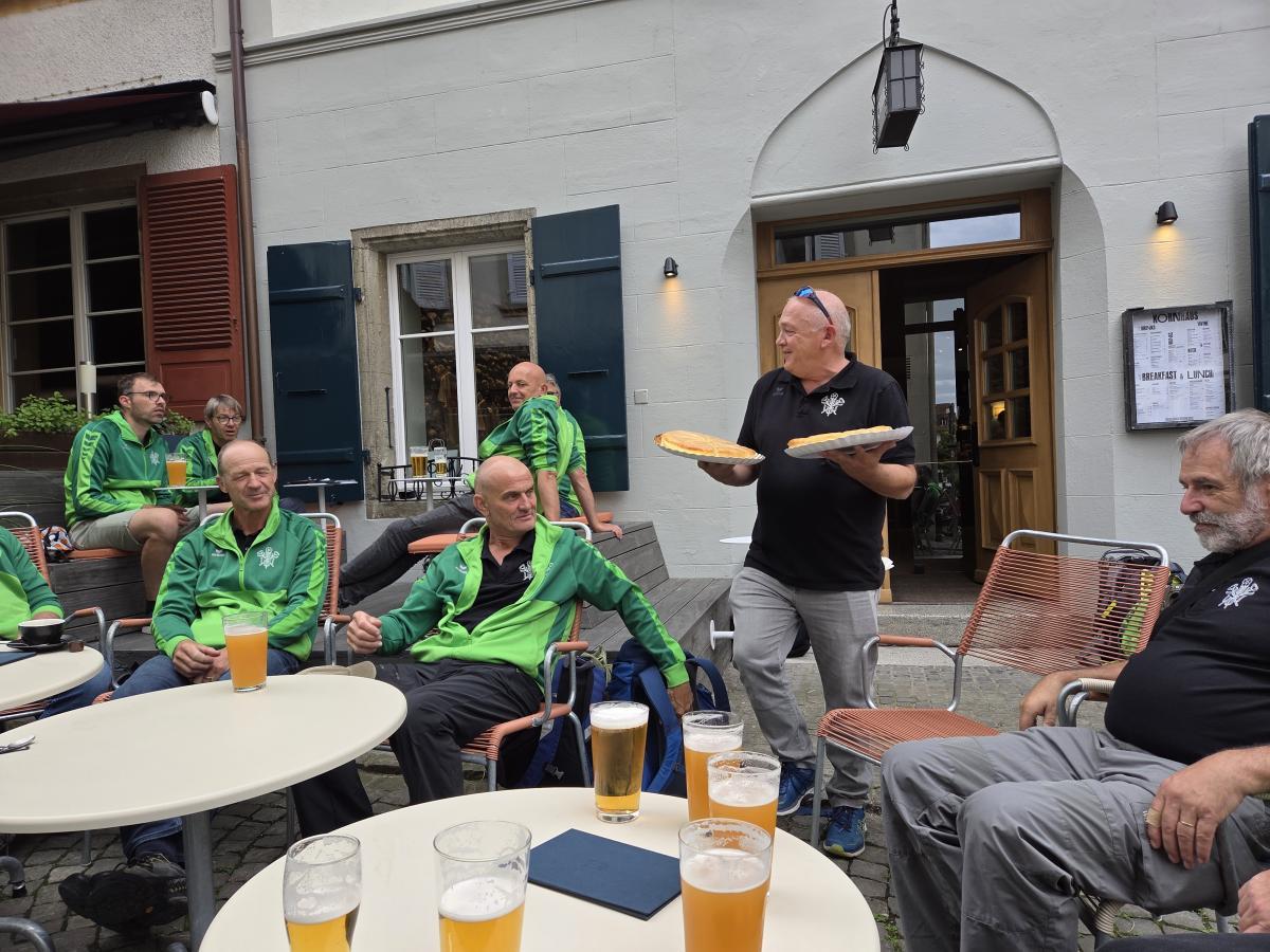 Über Einschusslöcher in den Stadtmauern, Brunnen, Ratshäuser, Laufstegen auf den Stadtmauern und etwas geschichtlichem, führte uns Geri durch Murten. Die Stadtführung gab schon recht Durst und so kehrten wir im Anschluss ein. Plötzlich war Thömel verschwunden, er kam mit 2 Nidelkuchen zurück (süsse Murten Spezialität).